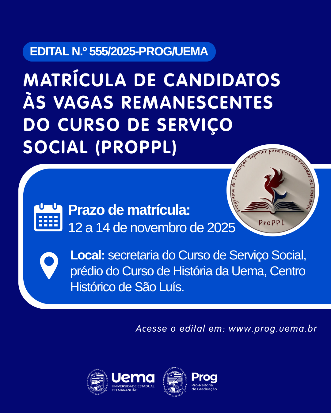 A Universidade Estadual do Maranhão (Uema), por meio da Pró-Reitoria de Graduação (Prog), publicou edital referente à matrícula dos candidatos às vagas remanescentes do Processo Seletivo Simplificado do Programa de Formação Superior de Pessoas Privadas de Liberdade (ProPPL), curso de graduação em Serviço Social, para o segundo semestre letivo de 2025.