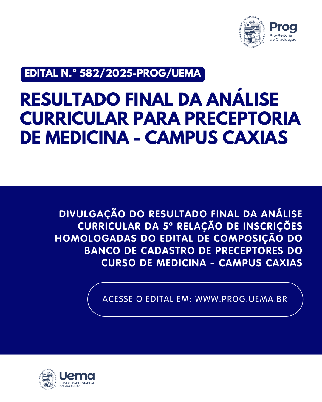 A Universidade Estadual do Maranhão (Uema), por meio da Pró-Reitoria de Graduação (Prog), torna público o resultado final da análise curricular referente à 5ª relação de inscrições homologadas para composição do Banco de Cadastro de Preceptores do curso de Medicina do Campus Caxias.