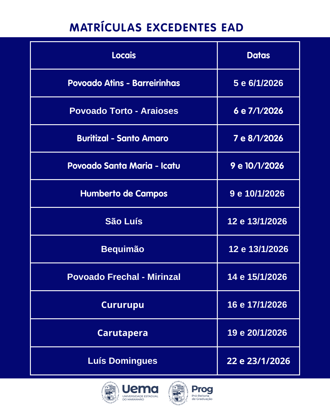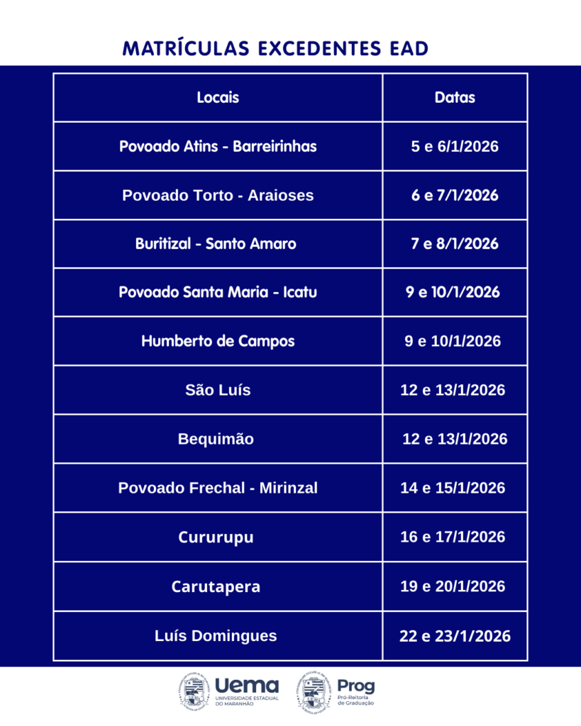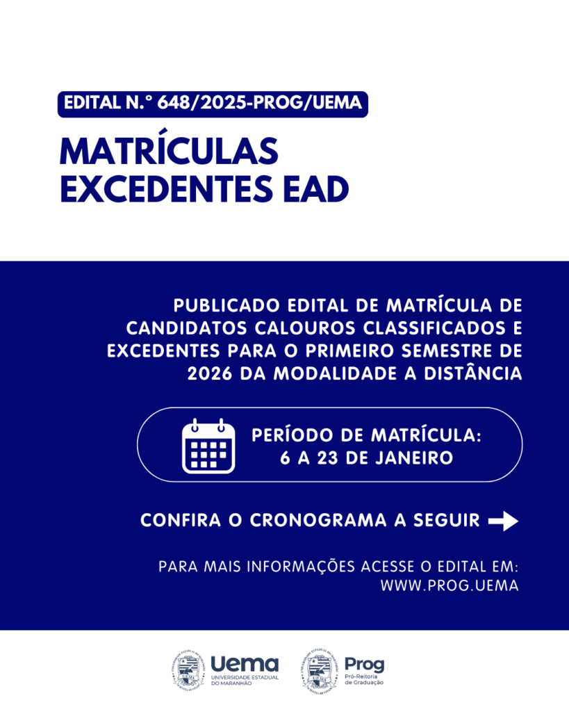 A Universidade Estadual do Maranhão (Uema), por meio da Pró-Reitoria de Graduação (Prog), tornou público o edital que dispõe sobre a matrícula dos candidatos calouros classificados e excedentes do Processo Seletivo Simplificado Especial EAD Uema 2025, para o primeiro semestre de 2026.