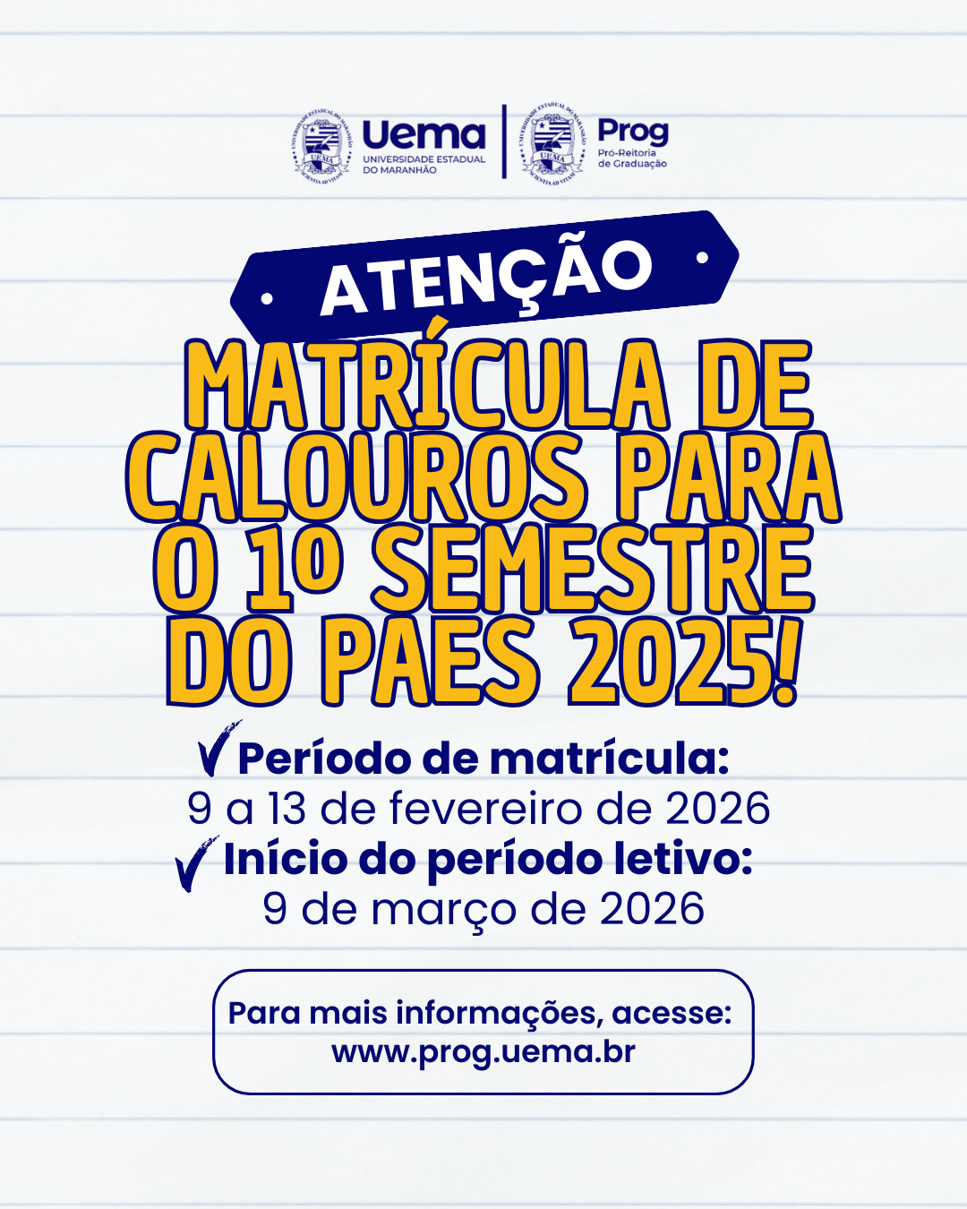 EDITAL N.º 45/2026-PROG/UEMA MATRÍCULA DE CANDIDATOS CALOUROS PARA O PRIMEIRO SEMESTRE PAES/UEMA