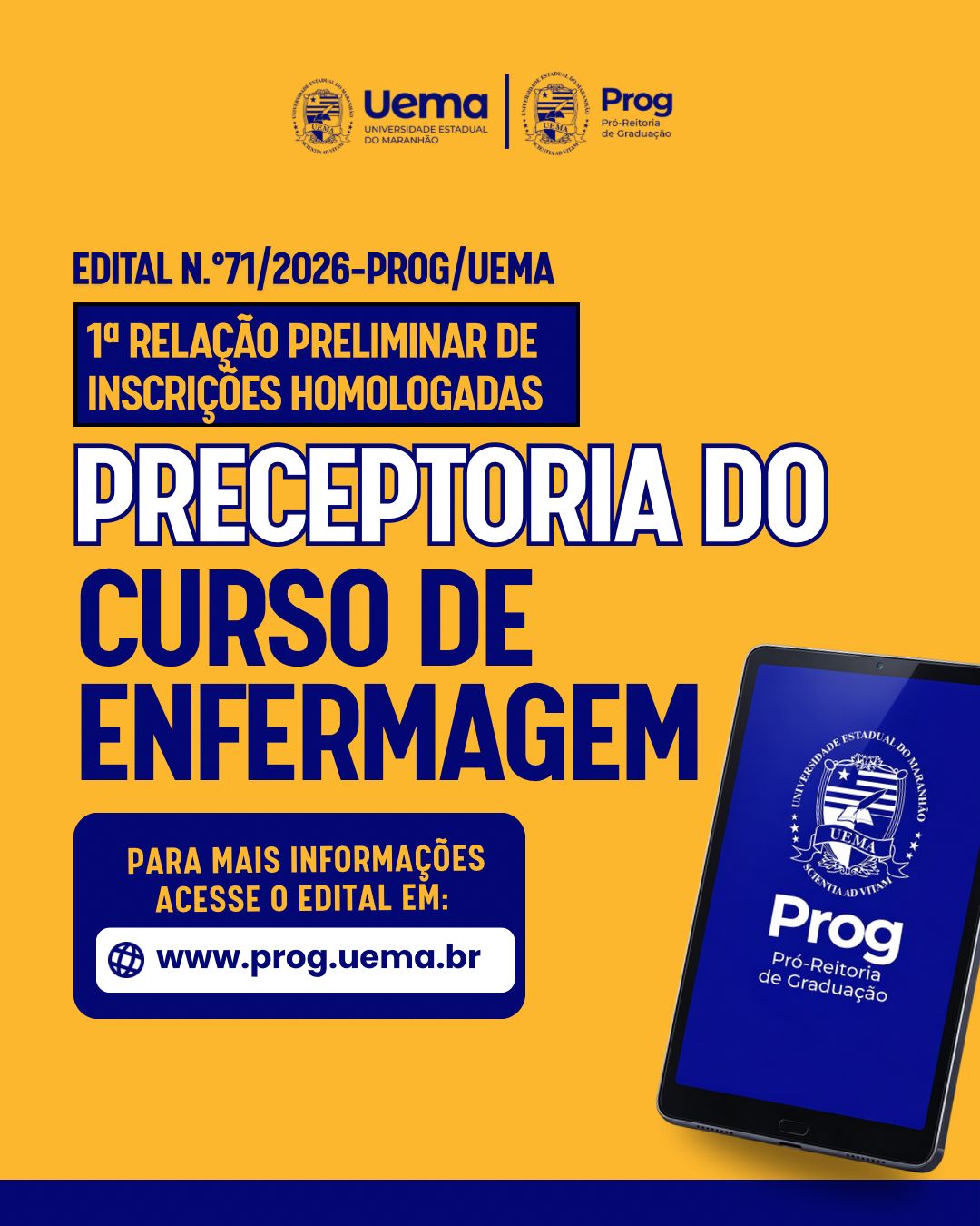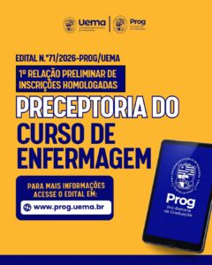 A Universidade Estadual do Maranhão (Uema), por meio da Pró-Reitoria de Graduação (Prog), torna pública a 1ª relação preliminar de inscrições homologadas para composição do Banco de Cadastro de Preceptores do curso de Enfermagem, mediante normas e condições estabelecidas no Edital n.º 51/2026-PROG/UEMA.