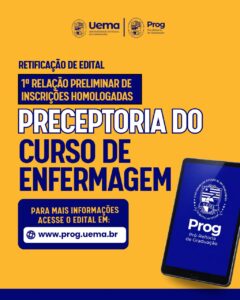 A Universidade Estadual do Maranhão (Uema), por meio da Pró-Reitoria de Graduação (Prog), publicou edital de retificação da 1ª relação preliminar de inscrições homologadas referente ao edital destinado à composição do Banco de Cadastro de interessados em atuar como preceptores do Curso de Enfermagem.