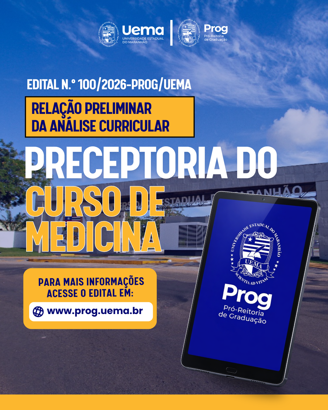 A Universidade Estadual do Maranhão (Uema), por meio da Pró-Reitoria de Graduação (Prog), torna pública a relação preliminar da análise curricular para composição do Banco de Cadastro de Preceptores do curso de Medicina, Campus Caxias, mediante normas e condições estabelecidas no EDITAL N.º 52/2026-PROG/UEMA.