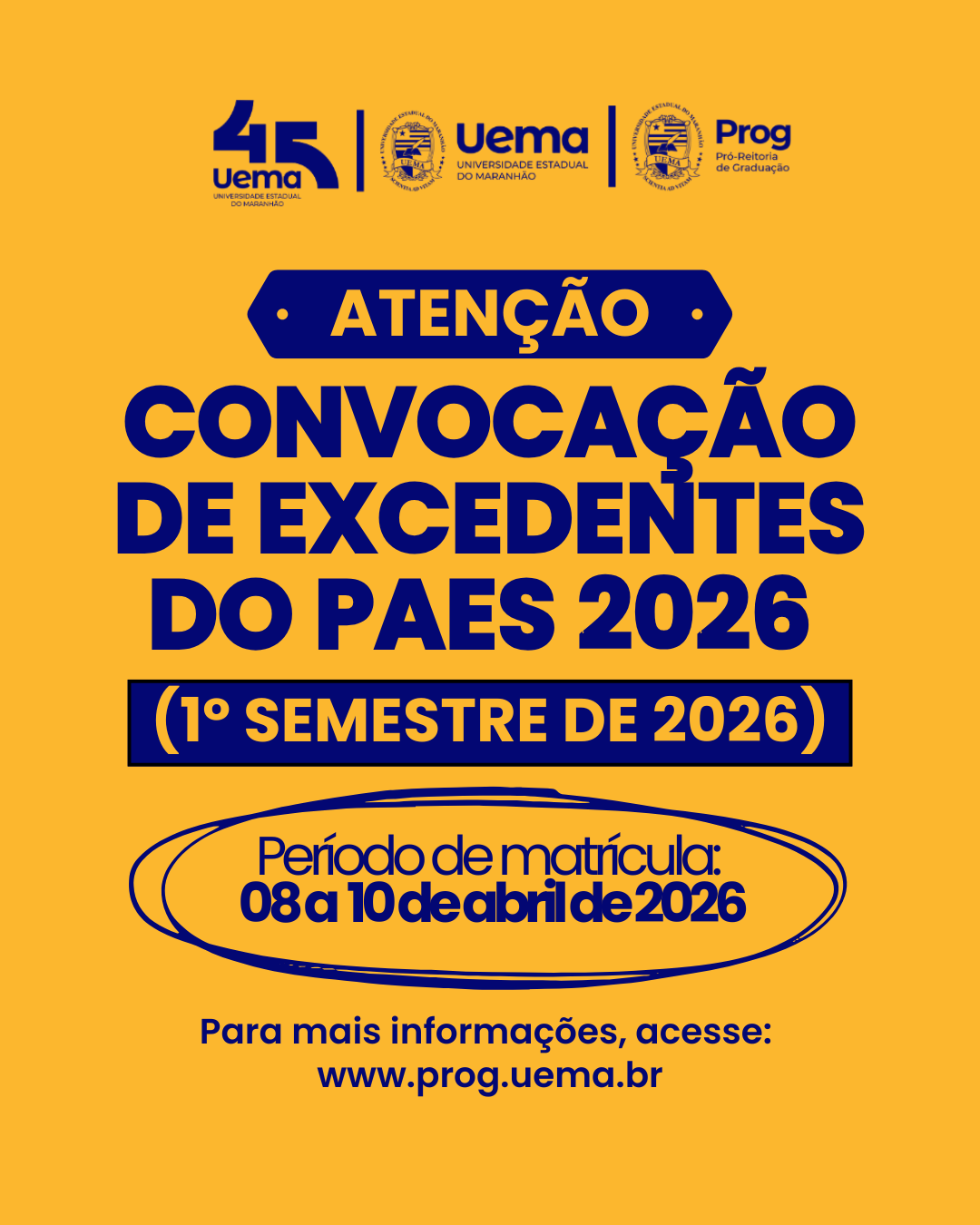 A Universidade Estadual do Maranhão (Uema), por meio da Pró‑Reitoria de Graduação da Uema (Prog), publicou 3ª chamada de convocação de candidatos excedentes e candidatos classificados da segunda entrada do Processo Seletivo de Acesso à Educação Superior (PAES) 2026 para realizarem matrícula no primeiro semestre letivo de 2026.