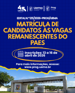 A Universidade Estadual do Maranhão (Uema), por meio da Pró-Reitoria de Graduação (Prog), publicou o edital de matrícula dos candidatos aprovados e classificados no Processo Seletivo Simplificado de Vagas Remanescentes do PAES 2026, destinado ao preenchimento de vagas para cursos de graduação presenciais no primeiro semestre de 2026.