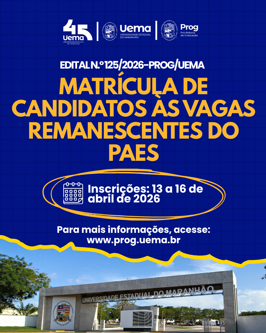 Confira todas as normas e orientações no edital: EDITAL N.º 125/2026-PROG/UEMA