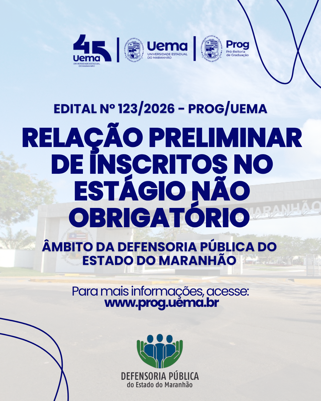 A Universidade Estadual do Maranhão (Uema), por meio da Pró-Reitoria de Graduação (PROG), divulgou a relação preliminar de inscritos no processo seletivo para estágio não obrigatório na Defensoria Pública do Estado do Maranhão (DPGE/MA).