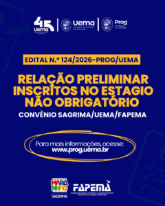 A Universidade Estadual do Maranhão (Uema), por meio da Pró-Reitoria de Graduação (Prog), divulgou a relação preliminar de inscritos no processo seletivo para estágio não obrigatório na Secretaria de Estado da Agricultura e Pecuária (Sagrima).